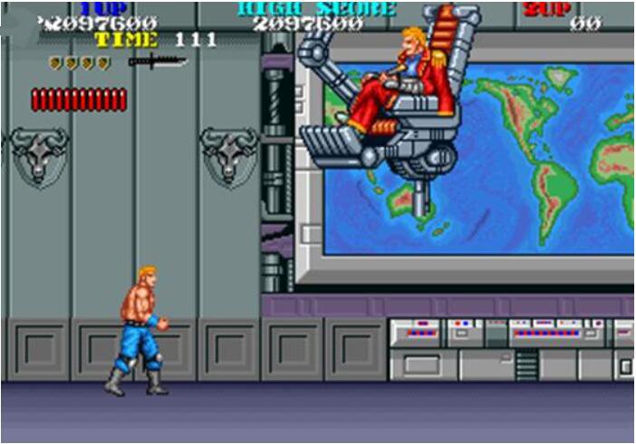 当玩家把椅子打烂后,BOSS终于露出了他真正的实力---手持游戏最强的武器火箭发射筒(比玩家拿的那个稍微逊色)!当他的子弹射完后就会他拳套的机关来攻击对手.当打倒BOSS后游戏会告诉你已经成为最出色的突击队员,但游戏真正完结了吗(似乎有隐藏剧情).总体来说这款游戏上手快,动作性很强,画面流畅,游戏的音乐非常有动感,是一款值得一玩经典动作游戏.