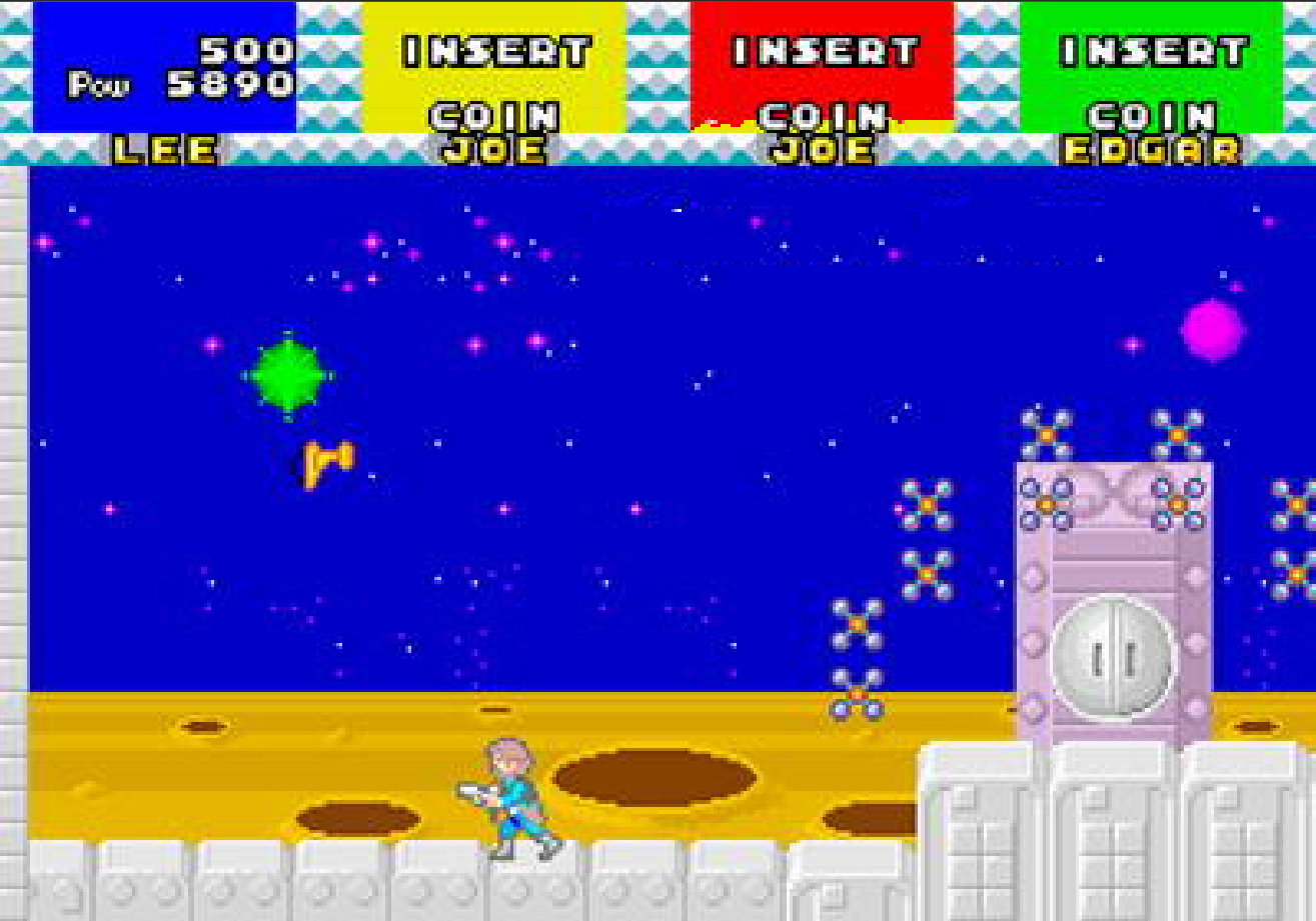 一个平台射击类街机游戏 从塞加到一个到四个球员混合,从乔(黄色),玛丽(红色),李(蓝色)和埃德加(绿色)选择。该操作发生在许多横向滚动级别上,其中大部分是由简单的平台动作组成的。然而,在某些层面上,玩家可以收集到喷气式背包,游戏的重点转向标准的横向滚动射击。