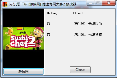 优达寿司大亨2两项修改器,使用时先运行游戏,再启动修改器,修改成功后字体会变红色,继续游戏。按键功能F1 无限银币(银币数为80000)F2