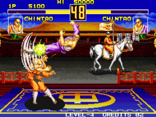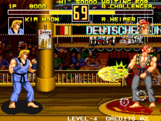 这个游戏很有街霸综合体的意思,可以说是《街霸》与《街霸2》的集成,加上《龙虎之拳》的音效.在本作中,玩家可以看到龙与肯的身影,只是必杀技的出如很复杂,几乎没用;终极boss不是画面上的白发老翁,而是另有其人。KOF收集狂 2006.5.26 VICCOM公司于MVS基板上推出的一款对战格斗游戏,游戏讲述世界各地的跆拳道健儿为了争夺跆拳道世界锦标赛的奖杯都各展所长.游戏里给人留下深刻印象的就是出必杀技的时候屏幕还会打出该必杀技的名字,而且都是汉字的哦(可能因为是韩国人制作的缘故)。另外游戏同样有超必杀技的存在,发动条件是体力见红后输入该角色特有的超必杀技指令即可使出。 当玩家击败了中BOSS跆拳道大师步择龙二后夺得了锦标赛的冠军奖杯,但赛后玩家收到了一封挑战信,原来是来自日本的空手道大师KARTE KENJI(空手健儿)的挑战.这名BOSS的招式非常霸道,杀伤力很高,很有最终BOSS的气派,对付他只能注意他招式的破绽进行反击.游戏整体水平不算高,游戏的人设不讨好(韩国人的美工和日本还是差个档次的).作为早期的格斗游戏之一,还是应该体验一下的!