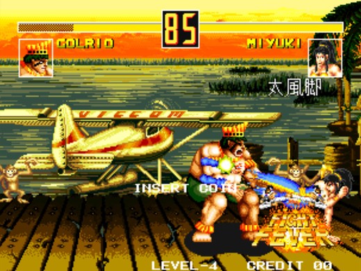狂热格斗这游戏很有街霸综合体的意思,可以说是《街霸》与《街霸2》的集成,加上《龙虎之拳》的音效。在本作中,玩家可以看到龙与肯的身影,只是必杀技的出如很复杂,几乎没用;终极boss不是画面上的白发老翁,而是另有其人。
