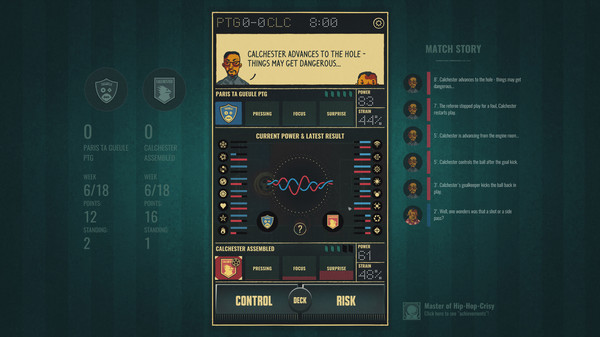 《足球戏剧正式版(Football Drama)》不是又一款新的《足球经理》,甚至不能称之为后者的简化版。在比赛过程中,你时刻只面临着两个选择(平衡或冒险,以不同的方式出现)以及收集卡牌,而卡牌允许你针对不同比赛对队伍配置进行个别更换。比赛的基础机制非常复杂,例如它不仅考虑了两支球队的力量维度,还考虑了天气、主场/客场、当前赛事结果和士气,但你无法对这些参数进行直接的调整。你无法自定义游戏,更改你的队伍或锦标赛模式。这只是一款半线性的叙事游戏,而叙事与冠军赛结果相互作用。