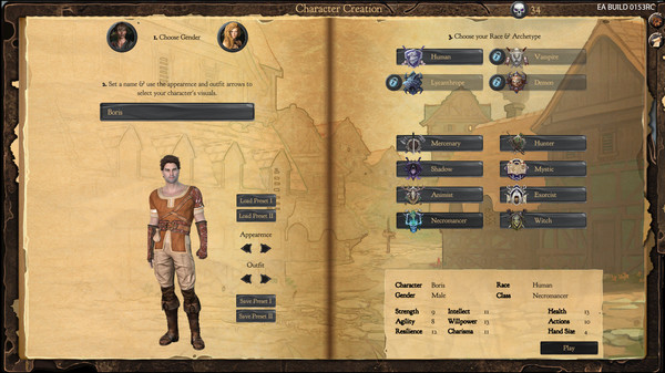 通过将你的种族(人类、吸血鬼、石人和恶魔)的不同属性和能力与你的阶级(雇佣军、影子、猎人、神秘主义者、万物有灵论者、驱魔者、巫师和巫师)混合,创造你的角色。