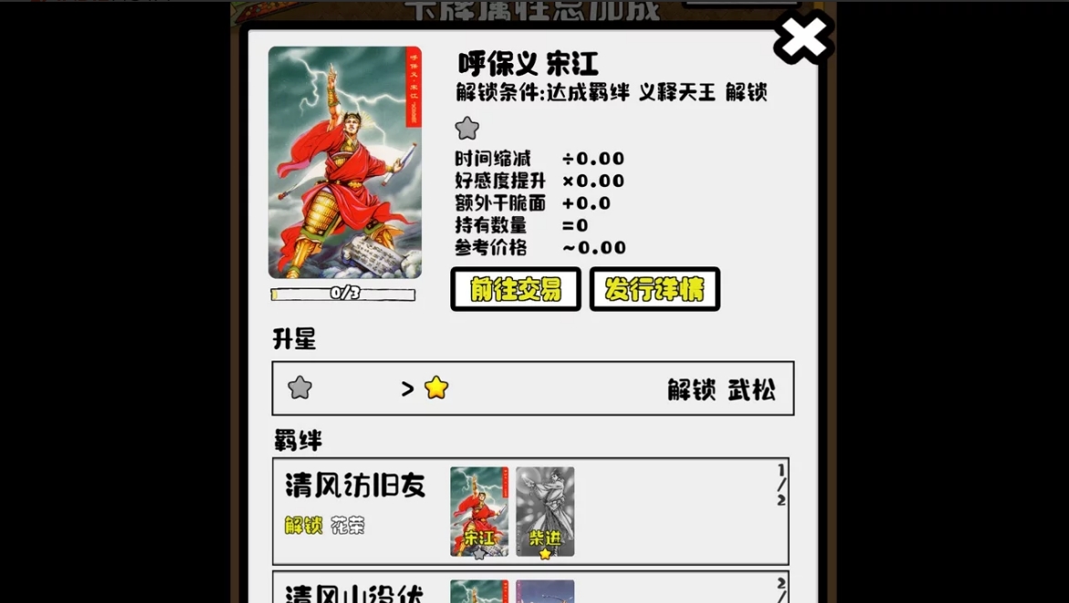 玩家可以从小卖部购买方便面,开出各色的水浒卡牌,从而达成羁绊,体验水浒英雄们的豪杰情义。玩家还可以在自由市场中,与其他玩家交易卡牌,来加快收集进度。重温儿时的集卡梦,一切由集卡的你们来决定!