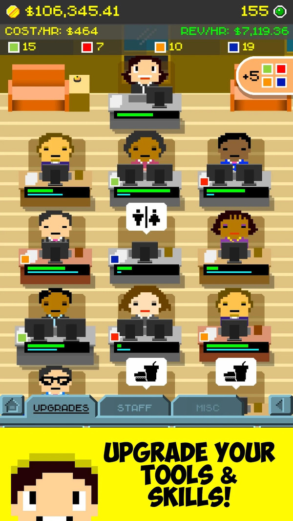 随着等级的提升,玩家可以扩充公司规模,数十款家具和电器可供选择,用于装饰和强化办公室,还可以配置特殊职员和宠物,增添趣味性;