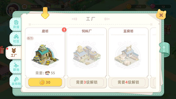 9、点击主界面右下角的“建造”选项,消耗金币就能为你的小镇打造房屋、社区、工厂、耕地以及各类装饰物。