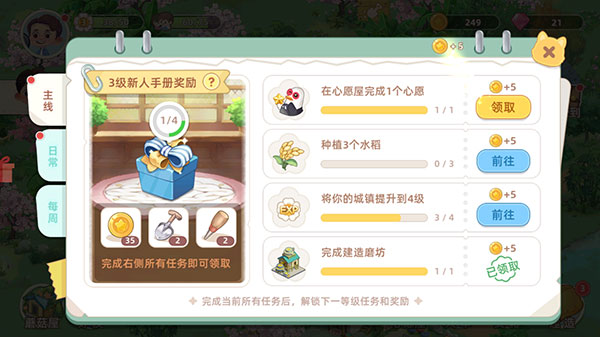 10、只要完成种植、建造以及心愿任务,就能获取对应的奖励金币。在任务界面,你可以查看主线任务和日常任务。