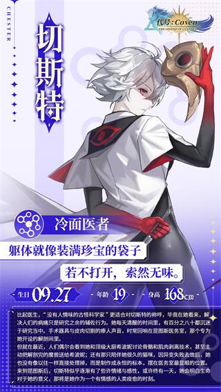 性格:不苟言笑,绝对理性,不喜交际,日常沉迷解剖之术