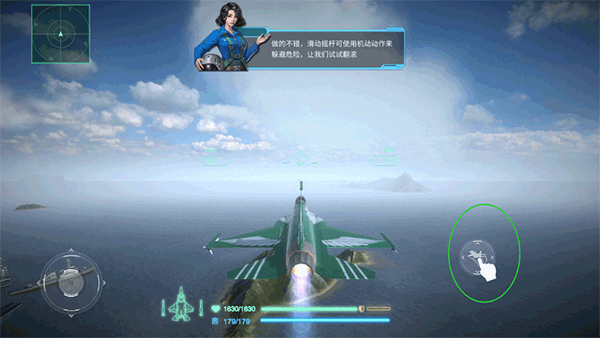2、接下来,按照指引对机器进行操作。位于左下方的圆圈是方向控制摇杆,可先向左滑动此摇杆,让飞机向左飞行一小段距离。