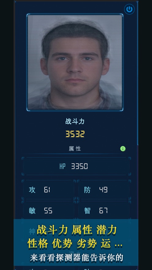 1、将摄像头对准人物就能分析,给出具体的属性数值,得出战斗力;
