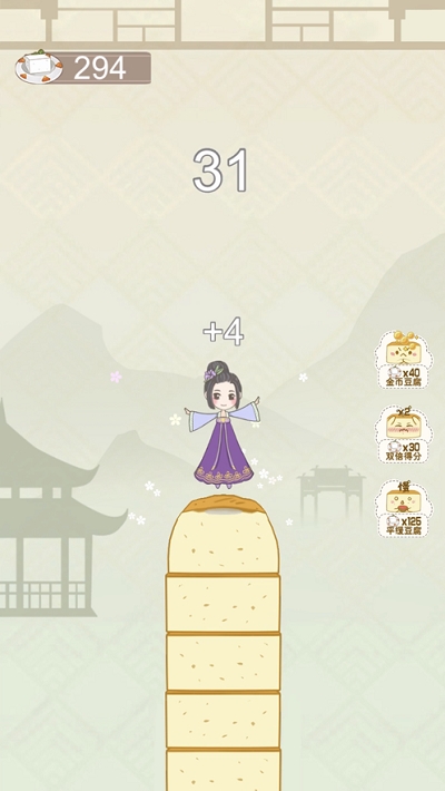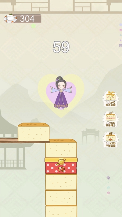 豆腐西施官方版是一款清新古风卡通风格的跳跃闯关游戏,简单上手的操作模式,通过不断堆叠来获取更高的分数,寻找时机点击屏幕,按住蓄力即可跳跃起来,下方会出现新的豆腐方块积累上去,挑战自己的极限高度,每日登陆还有丰富的奖励可以领取,更多精美时装任你切换。