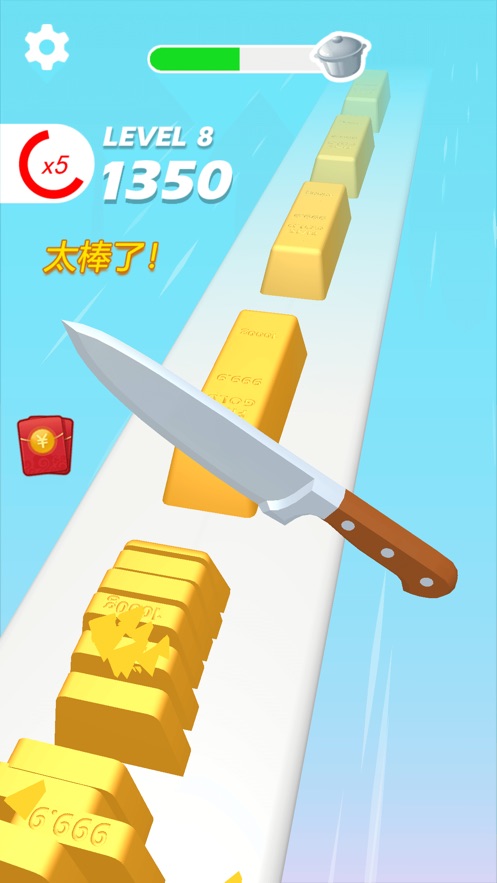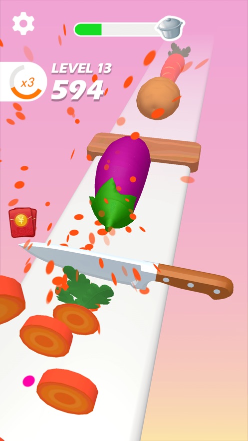 切菜是真的轻松哦,你们不需要有任何的技术操作,长按屏幕不动,菜刀就会自己进行切菜,遇到陷阱的时候就松开,