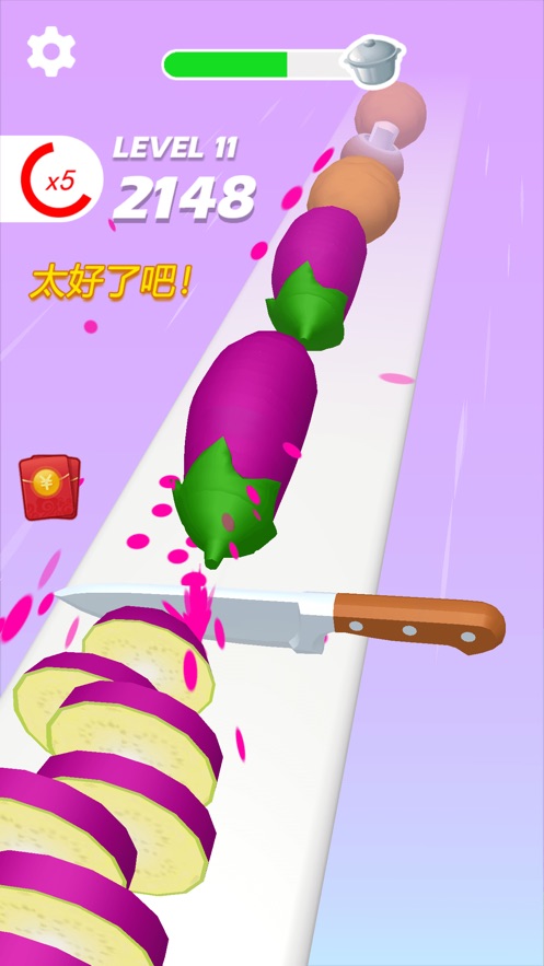 小李菜刀是一款当前切菜玩法十分新颖的解压小游戏,玩家可以在游戏中通过切菜来闯关,游戏的画质精致,而且切菜起来也是比较的轻松,这里有着最为吸引人的红包福利,就是需要将这些蔬菜全部切碎,根本就是没有什么难度,大家可以非常轻松的在这里的玩耍哦。