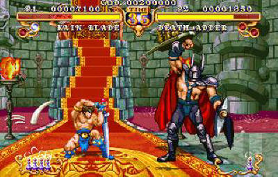 采用SS主机的互换基板ST-V来进行开发。格斗版依然保留了原作中以拾取魔法瓶来增加魔法的特色,游戏中和前作一样不时会出现背着大袋子的小矮人,攻击他们就会掉出魔法瓶.如何在抢到魔法瓶子的同时不被对手得到魔法瓶也是游戏中关乎胜负一个决定因素.游戏共有10个角色可供选择,除了个性鲜明的必杀技之外,各个角色还可发动超华丽的超魔法技。使用超魔法条件:集齐5个魔法瓶后,同时按下3个P键或3个K键即可开启超魔法时间槽,在该槽消失前可随意启动超必杀技。 游戏的画面拥有放大缩小特性,看起来非常不错。喜欢《战斧》的朋友绝对不容错过。