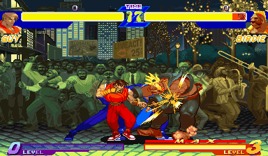 少年街霸ZERO相比于街霸八人版和十二版,少年街霸的画风明显改变了,虽然龙和肯还是主角,但动作却比老的街霸快了很多! 新加了几个人物,有快打旋风中的凯,罗斯等...1995年3月一款街霸最新作赫然出现在街机店中,那就是《街头霸王ZERO》!游戏从画风到人物设定都与前作有了云泥之差,游戏画面与卡通效果十分接近而动作则比X要流畅的多。这是CAPCOM彻底改造了《街头霸王2》引擎后的成果。而系统上的变化也同样是革命性的。空中防御、三段超必杀技与防御反击技等令这个游戏发生了前所未有的变化。一时间街霸旋风再度席卷了大小街机厅。不过在很多方面也存在着不足,人物数量大幅度缩水和场地严重重复都令玩家对此产生了抱怨。