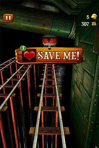《矿车大逃亡 Rail Rush》是一款类似神庙逃亡的跑酷游戏。你不小心进入了充满宝石和金块的山洞中,同时山洞四处也充满了危机,你乘坐着小矿车在轨道上奔跑,你能坚持多久?滑动你的手指,让小矿车跳动起来,并且收集更多的宝藏吧。