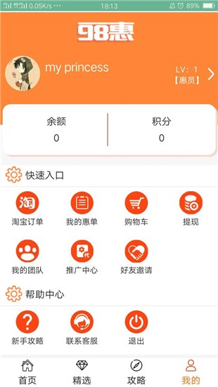 98惠app拥有推广和制度。普通用户为惠员,通过向朋友推广APP,自己可以获得积分。