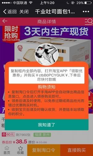 天天抵价券app集成天猫、淘宝、京东、美丽说等大品牌电商网站的优惠券信息,用户可以通过本应用快速方便地查找对应商品的优惠券,领取优惠券即可直接跳转淘宝app中下单。一气呵成,是淘宝粉丝、剁手党的福音。 点击复制淘口令之后弹出的对话框 轻点一次白色框中内容即可复制,无需长按复制!