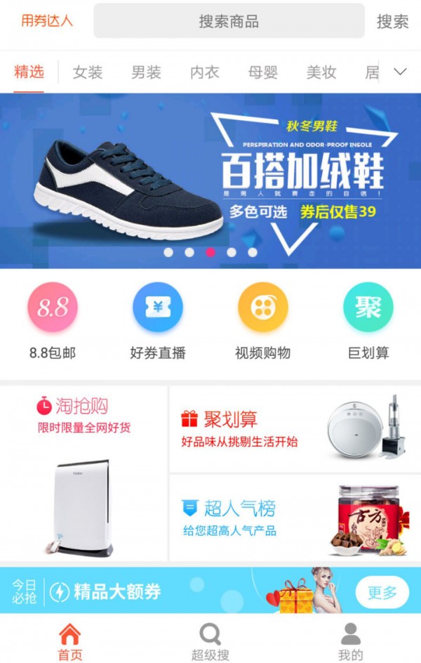 用券达人app是一款即刻搜索淘宝隐藏优惠券的软件平台。用券达人app每日更新上千种商品,低至1折再包邮。收录商品均经过人工审核。服饰、家居,母婴、家电、鞋包……全品类覆盖,用心生活,精明消费,省钱又省心。
