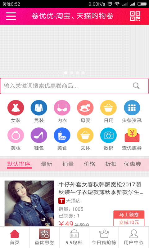 卷优优app是一款优惠券查询软件,卷优优app涵盖商品种类齐全,随时随地在线搜索优惠券商品,轻松领取优惠券,让购物更省钱。