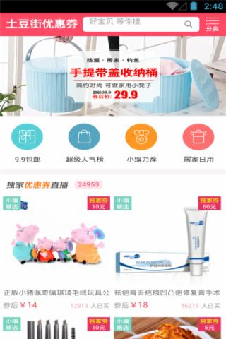 土豆街优惠劵网聚折扣商品,每日精选千款超值折扣商品9.9元起包邮1折优惠卖,每天10点限时购买!商品优惠卷,便宜!比卷皮,更加的好用!