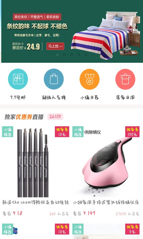 淘卷惠app聚折扣商品,每日精选千款超值折扣商品,9.9元起包邮,一折优惠卖,每天10点更新优惠商品及优惠券。
