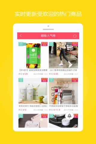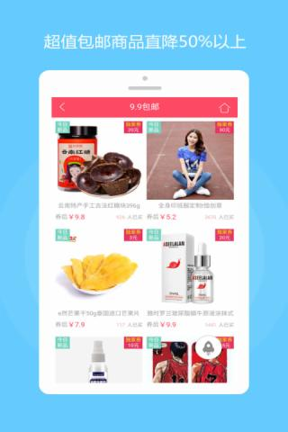 【功能亮点】 9.9包邮:众多几十元的商品券后9.9元包邮,超值超划算 超级人气榜:实时更新TOP100销量榜,看看剁手们都喜欢买什么
