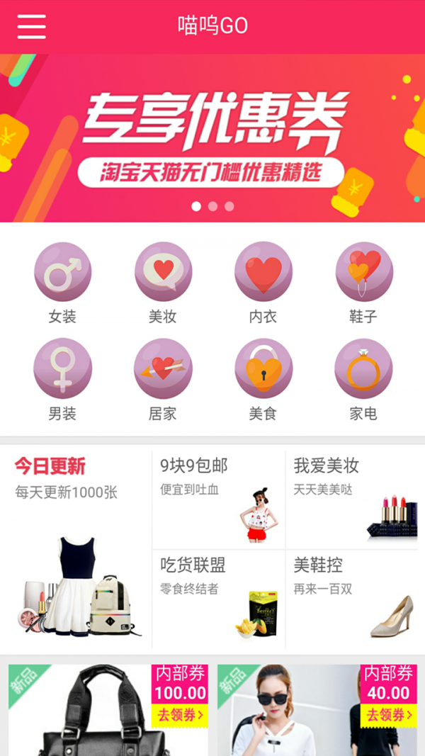 喵呜GO app是一款免费提供淘宝内部优惠券的网购平台,你可以在这里领取优惠券再购物,结算时价格更优惠,让购物更省钱。