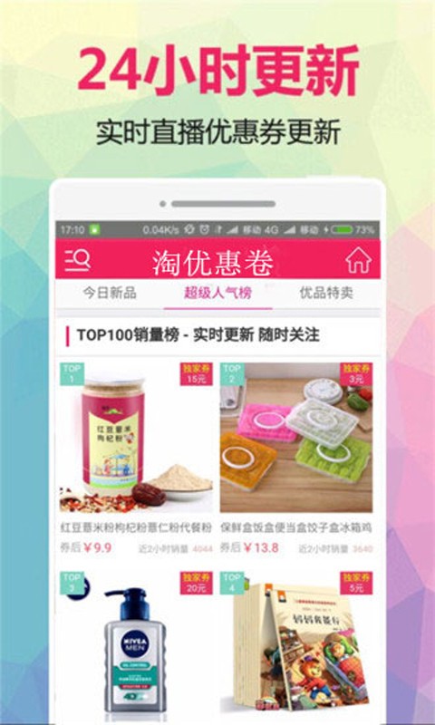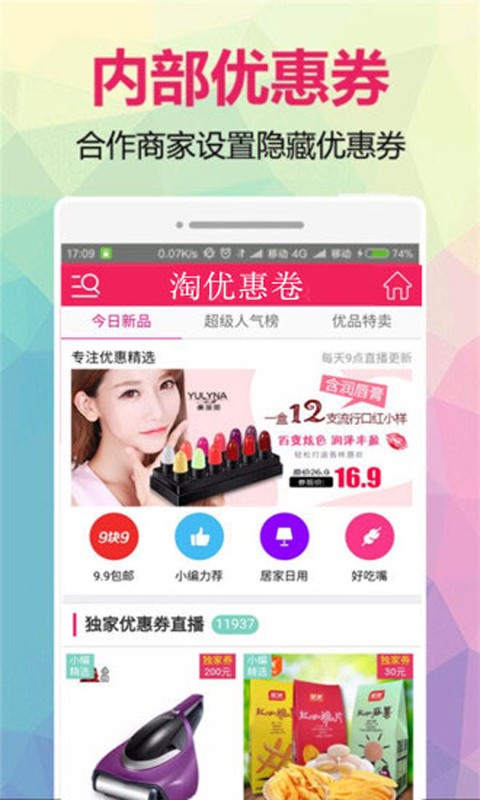 淘优惠卷app是一款折扣直播app!每天更新千款,纯人工筛选验货,限时限量特卖,全场1折包邮!每天24小时直播更新,打造良好导购平台,特惠商品实时更新
