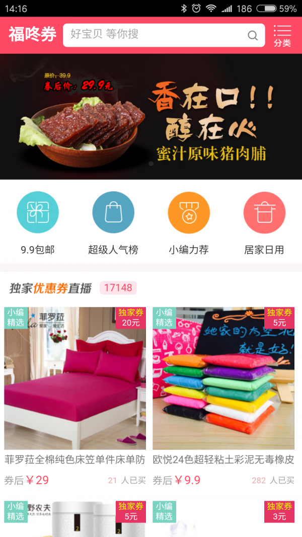 3、9块9包邮,1折优惠券,每天限量抢购;