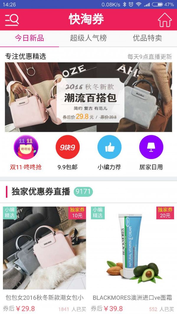 快淘券-优惠券折扣直播第一站!每天更新千款,纯人工筛选验货,限时限量特卖,全场1折包邮! 快淘券,国内优质的折扣电商平台,专注服务更广泛群体的日常生活所需。全场1折特卖,9.9元起全场包邮,更有品牌折扣,每日精选千款超值折扣,每天10点准时更新开抢!物美价廉!所有商品均由职业买手砍价而来,让您轻轻松松就能买到精品、低价、超值的商品!