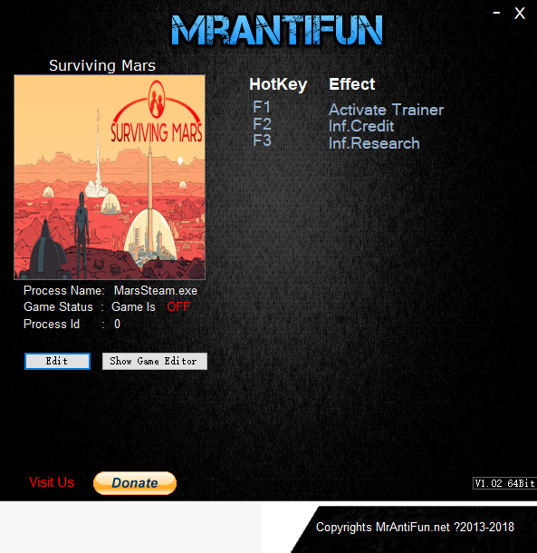 火星求生修改器是由论坛大神“MrAntiFun”为火星求生游戏制作分享的多功能游戏辅助工具,具有无限信誉、无限资源等两项修改功能,为玩家在游戏中可以战斗力拉满,所向无敌。