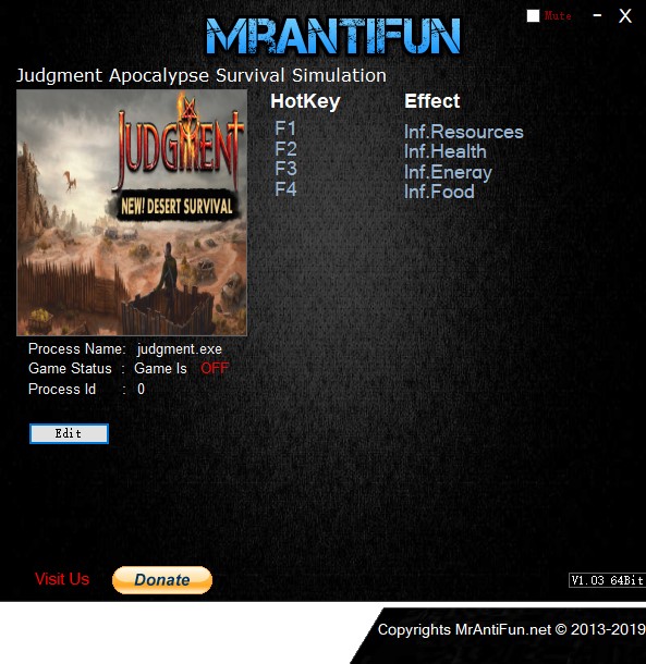 审判末世生存模拟修改器是由论坛大神“MrAntiFun”为审判末世生存模拟制作分享的多功能游戏辅助工具,具有无限生命、无限资源、无限能量、无限食物等四项修改功能,为玩家在游戏中可以轻松应对任何的困难。