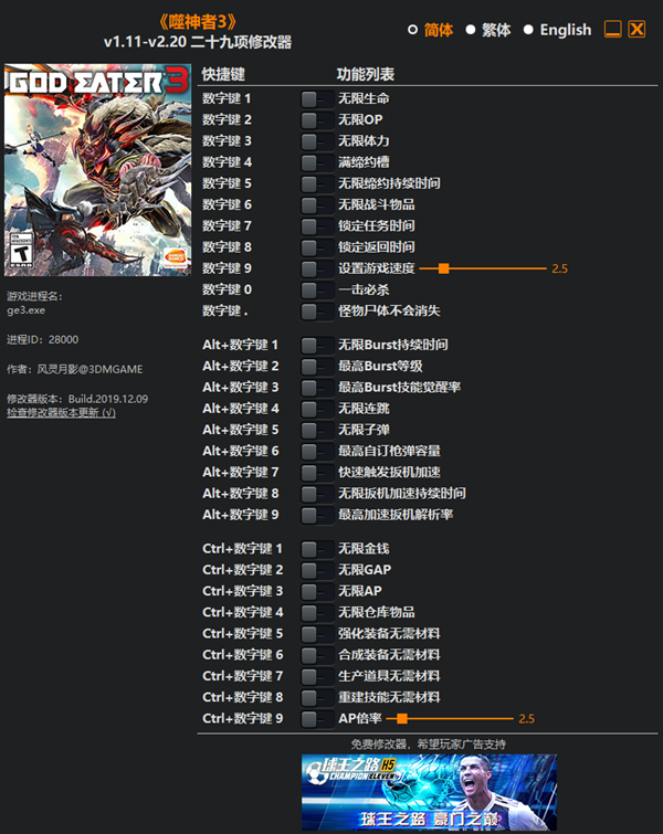 噬神者3二十九项修改器介绍噬神者3二十九项修改器是一个十分好用的游戏修改器,这里有着29种不同的修改选项,玩家可以在游戏中任意修改,在