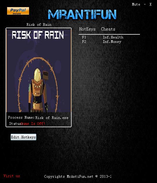 雨中冒险修改器是网友“MrAntiFun”为《雨中冒险》游戏专门制作的一款游戏辅助工具,支持无限生命、无限金钱共二项数据的修改,使玩家在冒险途中如神一般所向无敌。