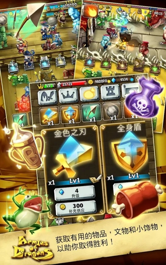 系统为我们准备了十多个属性士兵的选择,我们可以一次控制五种士兵,而这五种最好是不同属性的士兵,这样就能对所有的敌人都有所克制相对。除了士兵之外,游戏还加入了20多个技能、10多个基地的选择,这些都可以到商城中去购买和强化,随着士兵、技能、基地的不断强化,我们的整体实力也会慢慢增加,那么消灭恶龙就指日可待了。