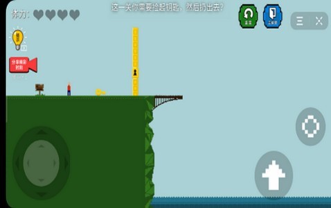 游戏是以闯关的方式来推进游戏进程的,控制你手中的小人进行关卡挑战。每个关卡的内容都不同,难度则是逐渐提升的。你需要通过屏幕上的虚拟按键和虚拟摇杆来完成小人的操控,移动方向,跳跃起来还有使用道具,关卡内有很多工具可以供你使用,记得合理的操控它们,让你的通关变得更加快速。游戏也还包含了一些解谜的元素,让你的游戏体验更加休闲,对玩家们的智力开发也有很大的帮助哦!