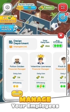 人力资源大师中文汉化版是一款卡通风格的休闲模拟游戏,化身为一家大型公司的HR,你的任务就是帮助公式招募到各个行业的精英,为公司赚取更多的利润,认真的给每一个来找工作的员工面试,绝对不能招募商业间谍进入公司,公司是否能够发展壮大就全靠你了呢。