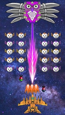 选择你喜欢的战机进行战斗吧!不同的战机能力也是不同的,比如有的射速比较快,有的是射程比较广阔,或者是伤害更高等等,都需要玩家自己来选择。当然你选择后的战机也是可以升级强化的,除了本身通过金币等等来强化之外,在游戏中也有可能遇到随机得加强道具,操作你的战机吃掉它们就能获得强大的战斗力!操控起来也非常简单,滑动屏幕即可完成。每个关卡的最终BOSS都是银河鸟哦,他们还会发射小型的银河鸟对你造成大量的伤害!躲避开来并快速的消灭主体吧!