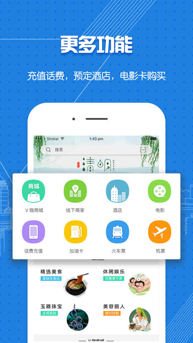 V咖生活 APP,为会员提供专属积分 “V点”消费,可以用于兑换相关商品和线下消费,其中相关商品包括 话费充值,电影卡,酒店住宿,和商城多种商品,线下商家涵盖国内近千家各类商铺,为会员提供更好的消费体验。