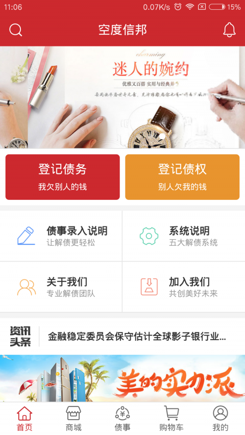 空度信邦商城具有商品浏览、购买、支付、收藏、物流查询等功能,同时商城具有债务录入的功能,APP录用线上录入的债务信息进行线下解债,使得企业去产能、去库存、去杠杆、降成本、补短板,让负债企业重生。
