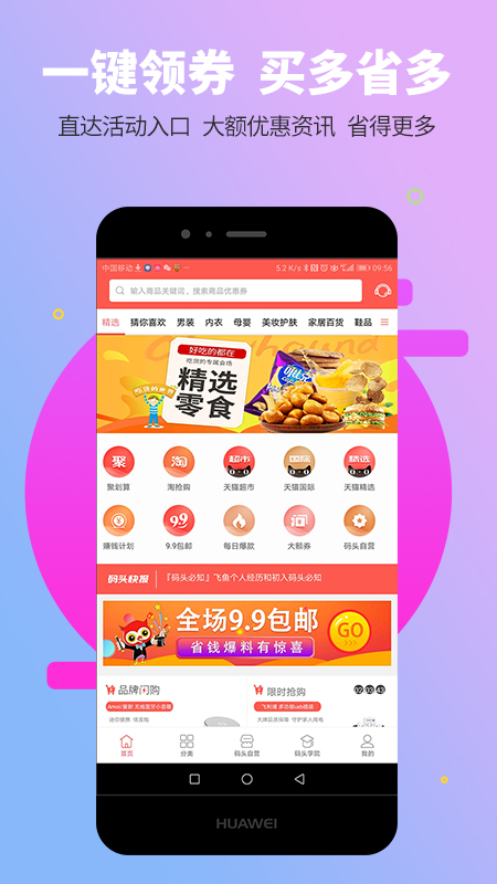 整合成千上万的电商商家,每天呈现多大几万的品类实惠、高折扣的商品,及海量大额优惠券每天更新。
