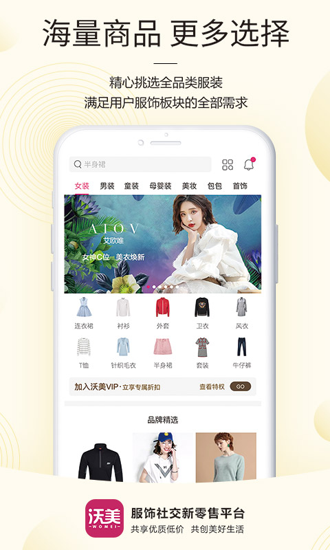 沃美APP是一款以服饰为主题的移动端商城,平台为每位店主提供一家在线服饰品牌折扣店,让创业者手机开店,轻松创业。