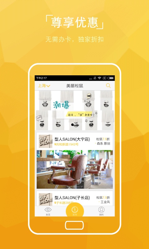 当热爱生活的你遇见美丽松鼠,当美发成为一种诠释,专享定制由此而生。所有的色彩、造型都成为了你个性的表达!在这里,你不需要把时间浪费在选择、预约、等待上,更无需办卡就能轻松享受优惠折扣。搜罗大街小巷特色发艺匠人,精选放心商家,提供全贴心的服务,让你随时随地悦享一份专属于你的美发体验!