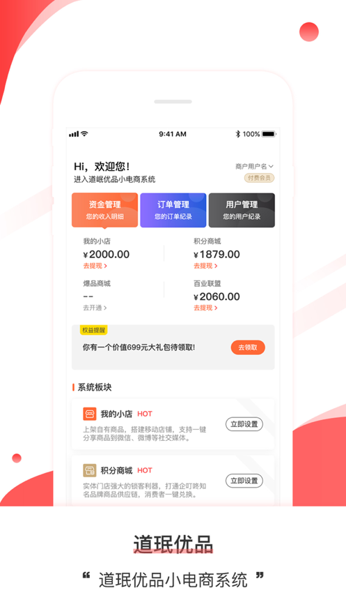 学会社区电商运营体系,使用道珉优品小电商系统提供的先进的爆品商城、我的小店、百业联盟和企叮咚赠送的积分商城,玩转社区运营 , 足不出户 ,实现创业梦想 。