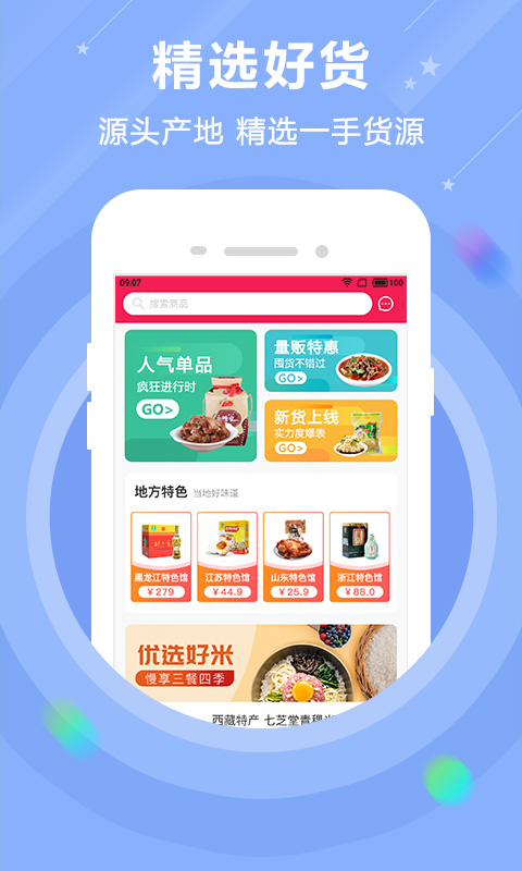 精选好货:源头产地,精选一手货源,覆盖全国上千个地区市场,一站式代销农产品,