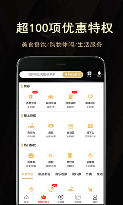集天猫/淘宝/京东/滴滴/美团/大众点评等平台的折扣权益于一身,覆盖美食、娱乐、出行、旅游、购物等超百项特权。
