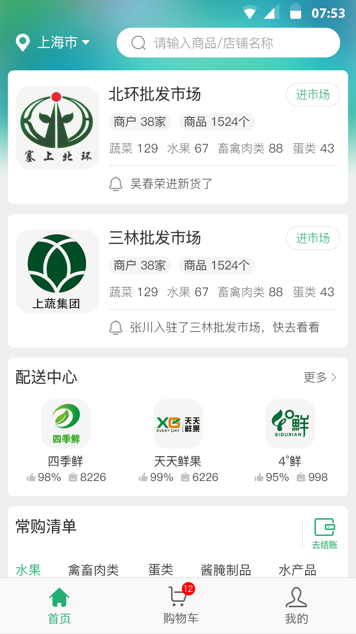 为菜场、生鲜零售、饭店食堂等采购人员提供的用于手机进货的APP,可在线下单、手机支付、跟踪物流等,帮助采购商轻松订货,享受集单配送服务,告别三更半夜、挤进挤出、搬上搬下的辛苦。