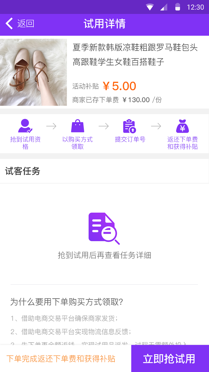 试用行业领跑者,全新试用方式,获得免费商品不用等待,抢试用模式抢到即得到,体验商家全部购物流程,获得试用品无需返还,更有保障。