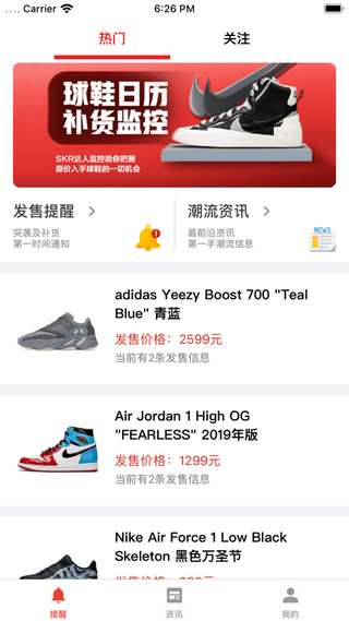 通过实时监控全球球鞋各大网站的发售,突袭,补货信息。包括NIKE,ADIDAS,AJ,YEEZY等,通过消息推送,让你不在错过任何机会,轻松skr达人!